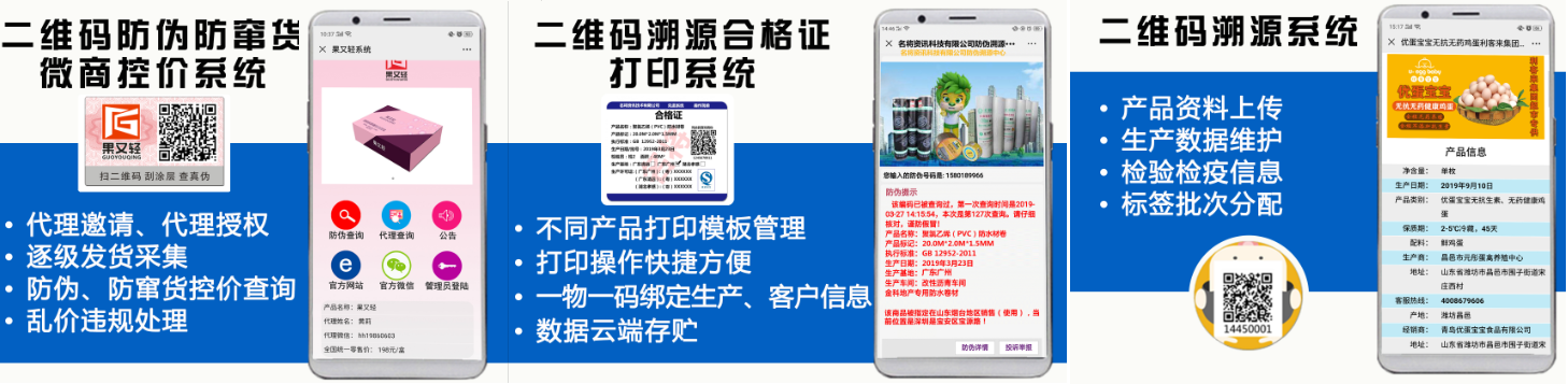 深圳市名将资讯技术有限公司亦提供防窜货溯源系统 、微商控价系统、 防伪查询及会员积分兑奖系统 、条码(二维码)追溯系统,专注一物一码标签应用。
